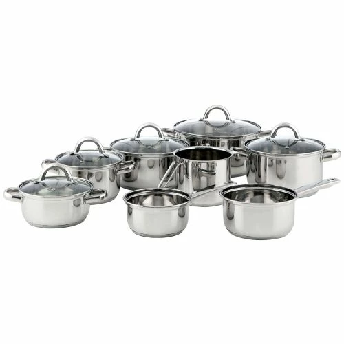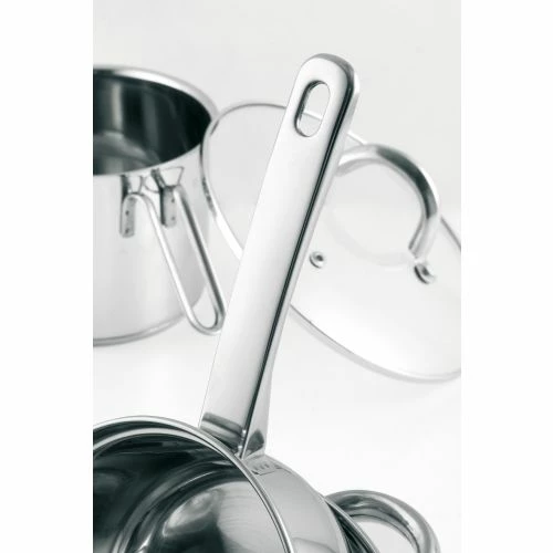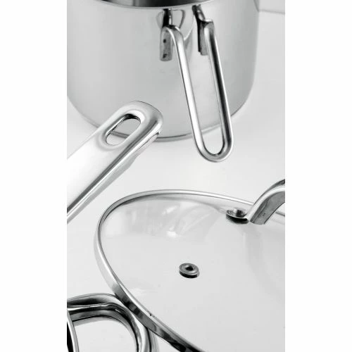 Asas/Mango Acero Buena distribución del calor y menos necesidad de potencia. Cacerola 16cm, cacerola 20cm, cacerola 24m, olla 16cm, olla 20cm, cazo 14cm, cazo 16cm, hervidor 14cm. Apto Vitrocerámica Apto Inducción Apto Eléctrico Apto Gas Apto lavavajillas Para un uso duradero recomendado lavado y secado a mano