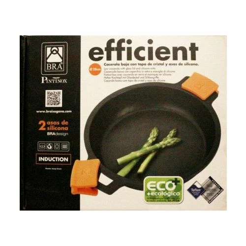 Cacerola baja de 28cm en aluminio fundido con tapa Efficient BRA – Fabricada en aluminio fundido de 6 mm, con fondo de gran espesor, capa máxima anti adherencia Platinum Plus libre de PFOA, máximo rendimiento del calor. – Con tapa de cristal y asas naranjas de silicona desmontables. – Apta para todo tipo de cocina, incluso inducción – Cuerpo apto para horno hasta 220ºC (usar en el horno sin la tapa de cristal y las asas de silicona). – Capacidad : 3,1L (4-5 porciones) – Dimensiones: Ø28 cm/ Base: Ø21,8 cm/ Altura: 6.3 cm