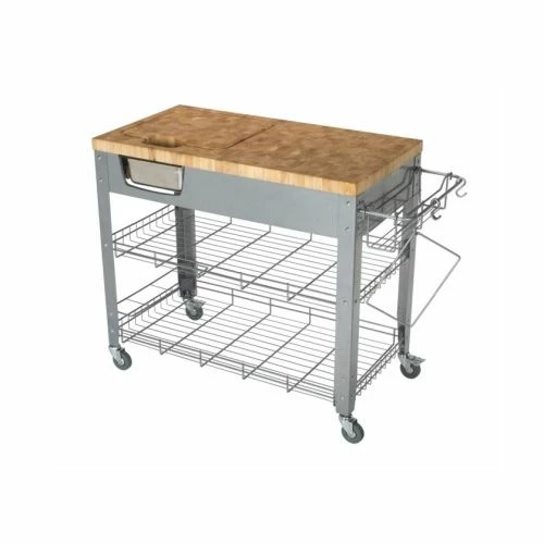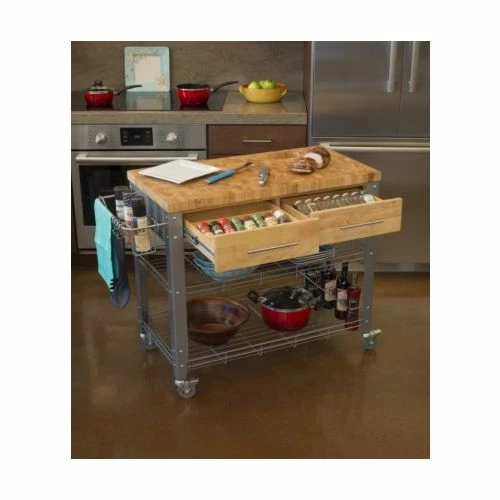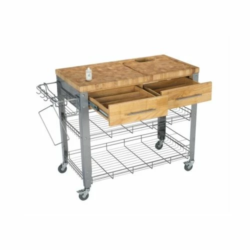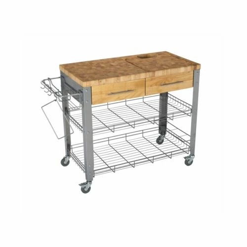 Estacion de trabajo de gran calidad y estéticamente agradable, diseñada por chefs profesionales.Diseñado para trabajar proporcionando superficies de trabajo duraderas, de calidad profesional y espacio de almacenamiento inteligente para su hogar. Con ruedas para facilitar su movilidadEstanterías y accesorios para el almacenaje de utensiliosCon innovador sistema: Chop & Drop (agujero en la mesa)* Este exclusivo sistema permite la recolección sanitaria de jugos, la fácil recolección de alimentos preparados, la eliminación fácil de desechos y la limpieza sin esfuerzo.* Este sistema tiene un surco alrededor de la superficie de corte para recoger los jugos y dirigir su flujo al «Chop & Drop»* Debajo del Chop & Drop se puede colocar la bandeja para recolectar los jugos o el rack para recolectar los desperdicios.Carro de cocina de madera con patas y estructura en aceroMedidas: 50X97X88 cmDos cajones con gran capacidadSuperficie de madera solida de 40mm de Hevea BrasiliensisPatas de acero con recubrimiento