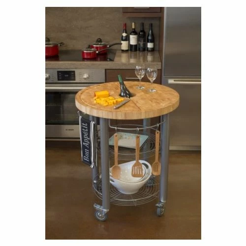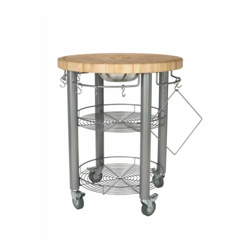 Estacion de trabajo de gran calidad y estéticamente agradable, diseñada por chefs profesionales.Diseñado para trabajar proporcionando superficies de trabajo duraderas, de calidad profesional y espacio de almacenamiento inteligente para su hogar. Con ruedas para facilitar su movilidadEstanterías y accesorios para el almacenaje de utensiliosCon innovador sistema: Chop & Drop (agujero en la mesa)* Este exclusivo sistema permite la recolección sanitaria de jugos, la fácil recolección de alimentos preparados, la eliminación fácil de desechos y la limpieza sin esfuerzo.* Este sistema tiene un surco alrededor de la superficie de corte para recoger los jugos y dirigir su flujo al «Chop & Drop»* Debajo del Chop & Drop se puede colocar la bandeja para recolectar los jugos o el rack para recolectar los desperdicios.Carro de cocina redondo de madera con patas y estructura en acero.Medidas: 76X91cmSuperficie de madera solida de 40mm de Hevea BrasiliensisPatas de acero con recubrimiento