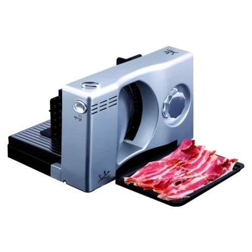 Potencia: 100 W Voltaje: 230 V. Zona de corte y carro de acero inoxidable. Mueble metalizado. Disco de acero alemán. Sistema de seguridad antiuso involuntario. Regulador de corte de alta precisión de 0 a 15 mm. Base plegable. Bandeja recogelonchas. Ventosas de fijación. Desmontable y fácil limpieza.