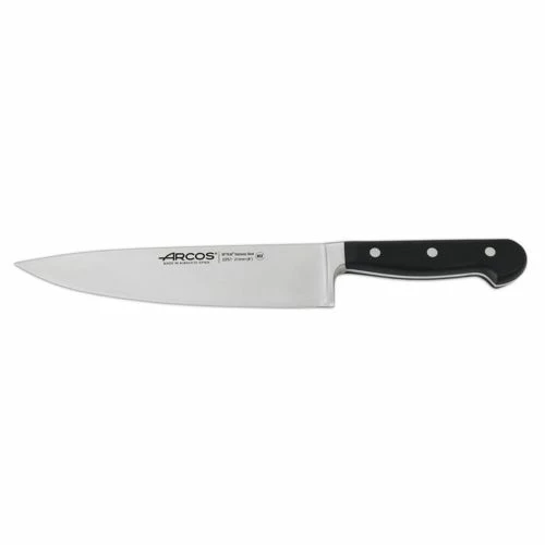 Cuchillo cocinero de 210 mm de hoja, fabricado con acero inoxidable forjado NITRUM®, exclusivo de ARCOS, aumentando sus cualidades de dureza. Destaca por su filo especial seda, en el que se aúnan los conocimientos de nuestros maestros con las nuevas tecnologías, para conseguir un corte que no deja indiferente. Sus formas clásicas del mango y remate redondeado hacen de este cuchillo uno de los más demandados por profesionales. Con remaches de tipo machihembrados de acero inoxidable altamente resistentes a la corrosión.