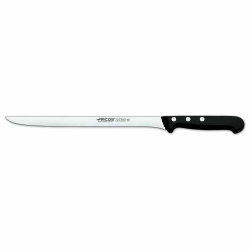 Cuchillo jamonero flexible de 24cm de hoja Serie Universal ARCOS – Material: Acero inoxidable NITRUM y mango de Polioximetileno con 3 remaches – Diseño de corte clásico. – Remaches machihembrados de acero inoxidable, de gran resistencia. – Fabricado en Albacete , 10 años de garantía del fabricante
