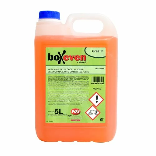 Detergente alcalino para el lavado y desengrase de utensilios y elementos de cocina, incluso suelos y paredes de azulejos. Especialmente indicado para eliminar grasas requemadas en hornos, freidoras y planchas de cocina. Garrafa de 5L. Líquido fluido de color ámbar y con olor fuerte. Uso profesional