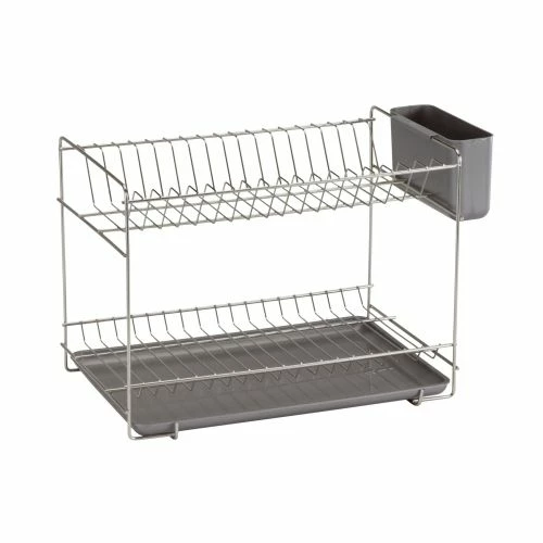 Escurreplatos fabricado en acero inoxidable 18/8. Capacidad para 18 platos. Con bandeja y escurrecubiertos de plástico de color gris.