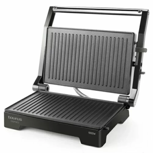 Tosta sándwiches, dora tostadas o prepara hamburguesas con el nuevo grill de Taurus Crispy & Co. Su potencia de 1000W te permitirá cocinar platos ricos y sanos sin necesidad de añadir ni aceites ni aditivos. ¡No lo pienses más y pon una Crispy & Co en tu cocina!. Potencia 1000W. Apertura 180º. Dimensión placa: 14,5 x 23 cm. Tapa basculante. Placa antiadherente libre de PFOA. Indicador luminoso de funcionamiento. Asa de toque frío. Base antideslizante. Pinza de cierre para almacenaje vertical. Acabados en acero inoxidable.