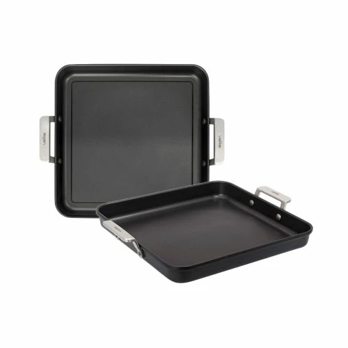 Grill plancha liso inclinado con asas 28x28cm. Aire VALIRA – Con nervio pronunciado para un acabado de auténtica parrilla – Aluminio fundido indeformable y de gran difusión del calor. – Mango de acero de elegante diseño y tacto frío. – Máxima rapidez y ahorro energético en placas de inducción. – Antiadherente premium sin PFOA. – Made in Spain bajo normativa europea de alimentariedad cumple norma de seguridad alimentaria en-601. – Apto para todo tipo de fuegos, incluido inducción.