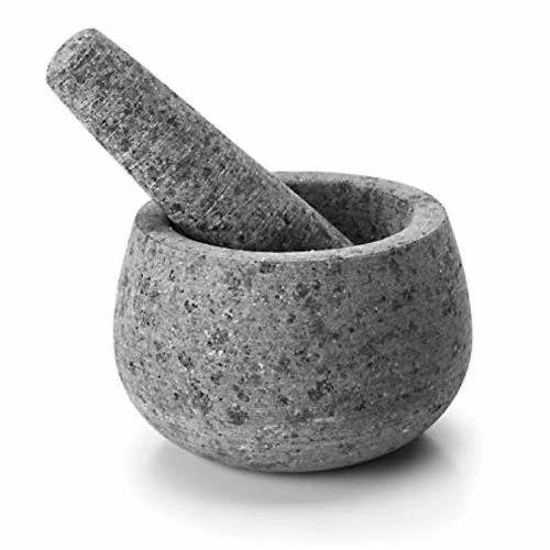 Juego de mortero y mano de granito. El interior no poroso permite la máxima extracción de aceites naturales y esencias de hierbas y especias. Interior de granito sin pulir completamente natural con exterior liso y pulido, este juego agrega un elemento natural a cualquier cocina. Dimensiones: 12 cm de diámetro x 8 cm de alto.