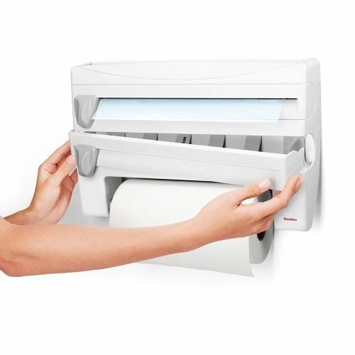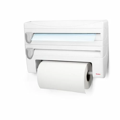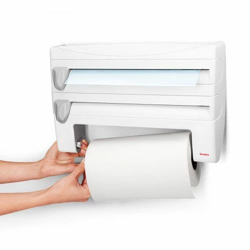 Dispensador 3 rollos cocina ROLL´N´ ROLL Para rollo papel de cocina, film transparente y papel aluminio. Con 2 cuchillas deslizantes, una de nylon para el papel aluminio y otra de acero inox para el film transparente. Fabricado en plástico PS reforzado color blanco Roll´n´roll cuenta con una práctica repisa en la parte superior para rollo de repuesto o botes de especias.