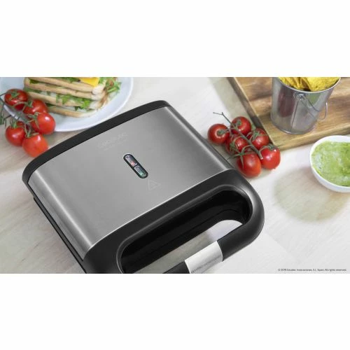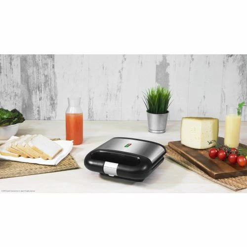 Sandwichera con capacidad para 2 sándwiches. Acabados en acero inoxidable. Revestimiento de piedra RockStone que consigue mejores texturas y sabores. 750 W de potencia. Placas cuadradas que comprimen los sándwiches para un tostado perfecto sin cortarlos. Revestimiento ecológico, libre de PTFE, PFOA y otros tóxicos. Indicador luminoso de alcance de temperatura. Asa de tacto frío con pinza de cierre que permite guardarla en vertical. Hueco recogecables y base antideslizante.