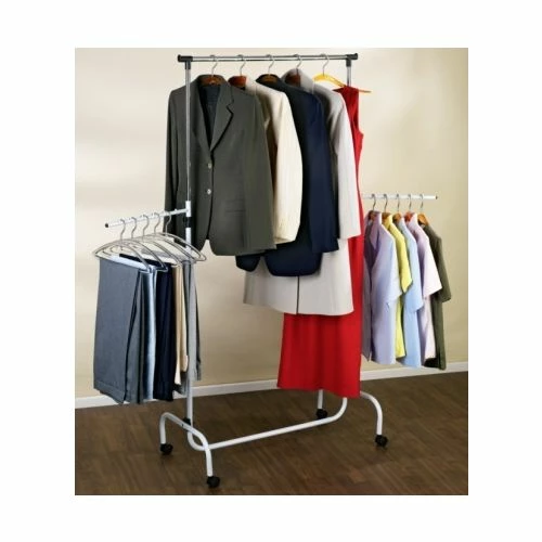 Perchero con brazos laterales para guardar, airear y transportar la ropa. Tubos de acero cromados y pintados en blanco con 4 ruedas para hacer el desplazamiento más fácil. Soporta 20 kg de carga.Altura regulable desde 118 hasta 165 cm.
